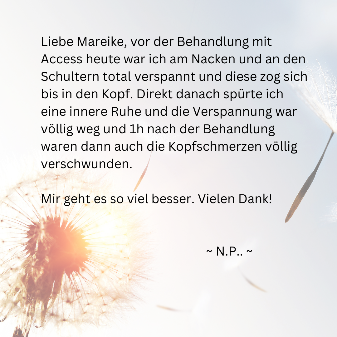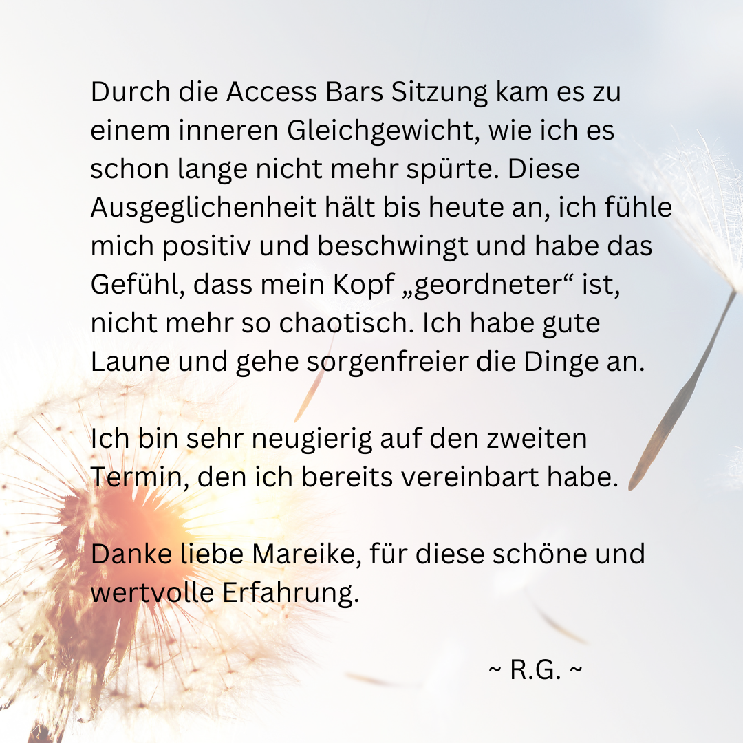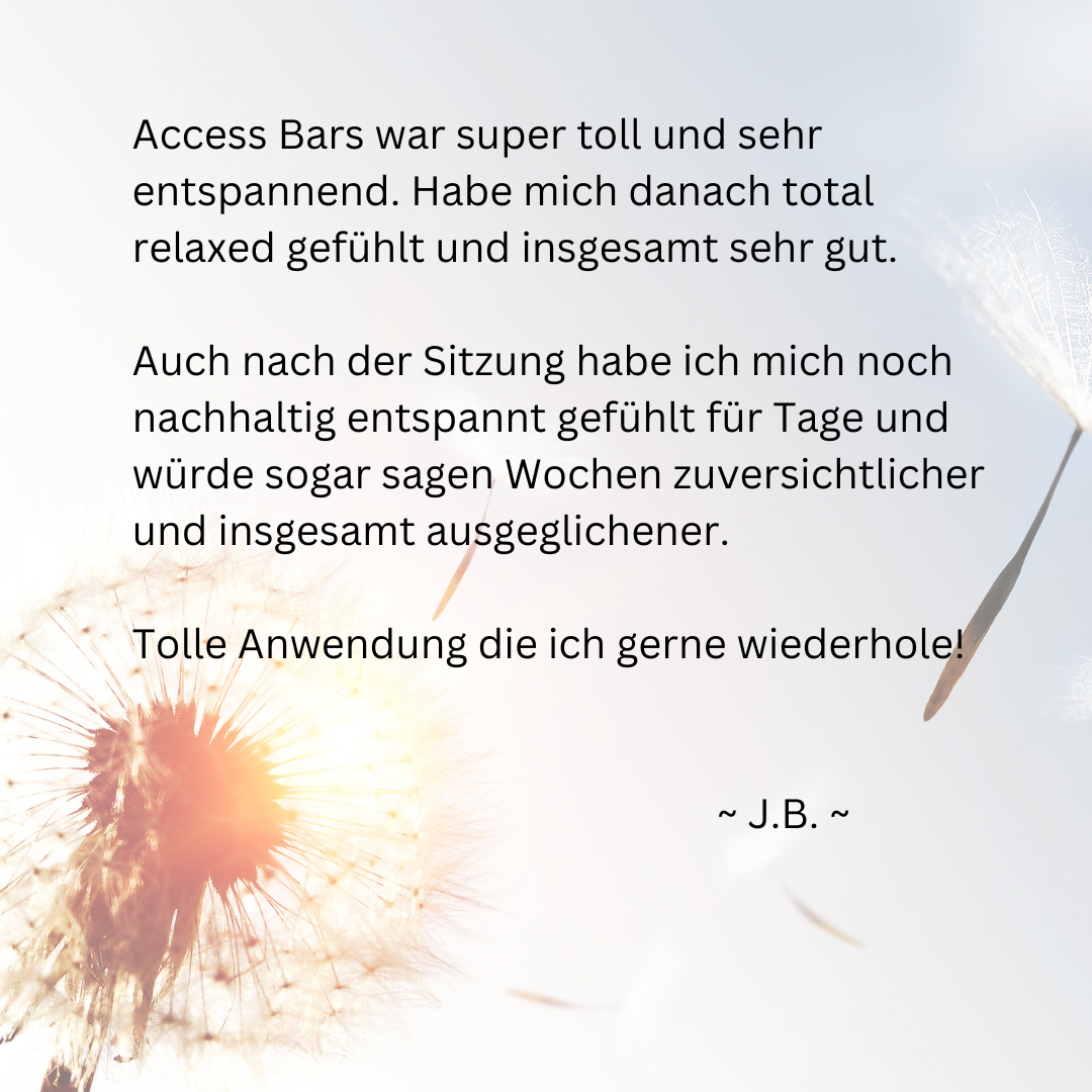 Wenn diese 32 Punkte in einer Access Bars® Sitzung sanft berührt und gehalten werden, lösen sich die Begrenzungen und entlädt sich die Spannung, die Du mit diesen Themen durch Bewertungen, Ansichten und Erfahrungen hast. Dadurch werden Gedanken, Glaubenssätze oder auch Emotionen freigesetzt, die Du in Deiner Lebenszeit gesammelt hast und die Dich davon abhalten, ein Leben zu kreieren, das sich richtig gut für Dich anfühlt. Eine Access Bars® Session ist wohl die entspannendste, entstressendste Wohlfühlanwendung, von der Du vielleicht noch nicht mal etwas gehört hast…