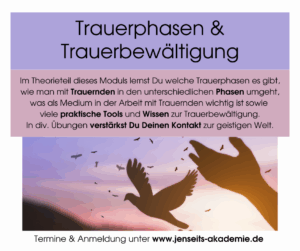 In der Jenseits-Akademie®, die ich mit meiner Freundin und Kollegin Liza Fuchs geb. Gillhuber seit 2021 leite, kannst Du spielerisch Deine Fähigkeiten entdecken, diese ausbauen und intensivieren – egal ob Du diese nur für Dich persönlich oder für Deine zukünftige mediale und/oder energetische Arbeit beruflich nutzen möchtest.