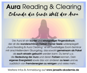 In der Jenseits-Akademie®, die ich mit meiner Freundin und Kollegin Liza Fuchs geb. Gillhuber seit 2021 leite, kannst Du spielerisch Deine Fähigkeiten entdecken, diese ausbauen und intensivieren – egal ob Du diese nur für Dich persönlich oder für Deine zukünftige mediale und/oder energetische Arbeit beruflich nutzen möchtest.