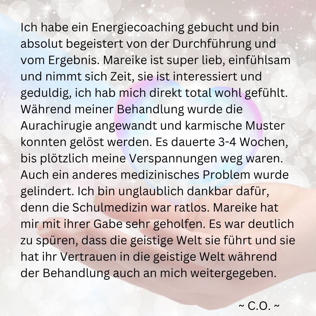 Aurachirurgie kann in ein Energie-Coaching integriert werden, dann verlängert sich der Termin auf insgesamt circa 3-3,5 Stunden. Gib mir bei der Terminvereinbarung gerne einen Hinweis, dass Dir Aurachirurgie im Energie-Coaching wichtig ist, damit ich die Zeit entsprechend einteilen kann.