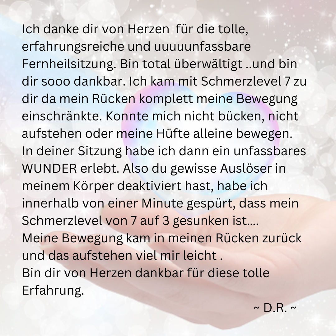 Somit werden die Ursachen in früheren Leben als auch in Deinem aktuellen Leben in Harmonie gebracht, was für mich ein elementarer Bestandteil der vollständigen Heilmöglichkeit ist.