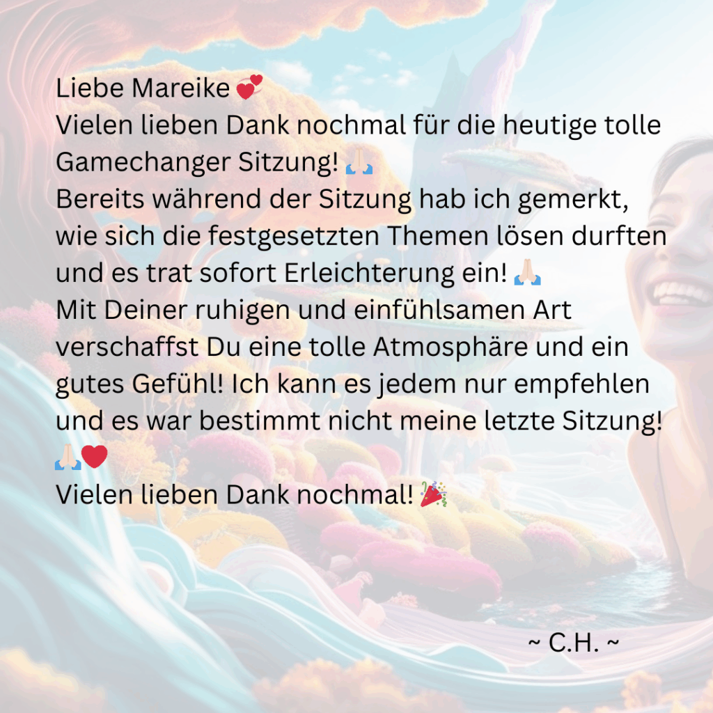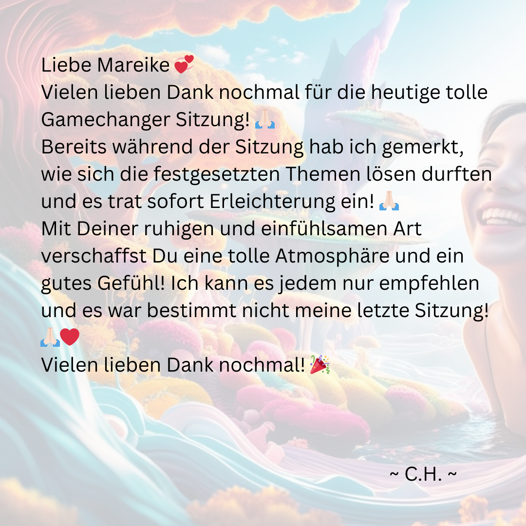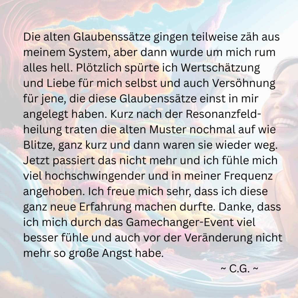 Da es meist sehr viele verschiedene Muster, Traumata, Prägungen oder Ansichten zu „shiften“ gibt und es mir persönlich wichtig ist, Dich mit einem befreiten, losgelösten Sein in ein unbeschwerteres Lebensgefühl (gehen=) zu lassen, empfehle ich 2-3 Gamechanger Sessions.