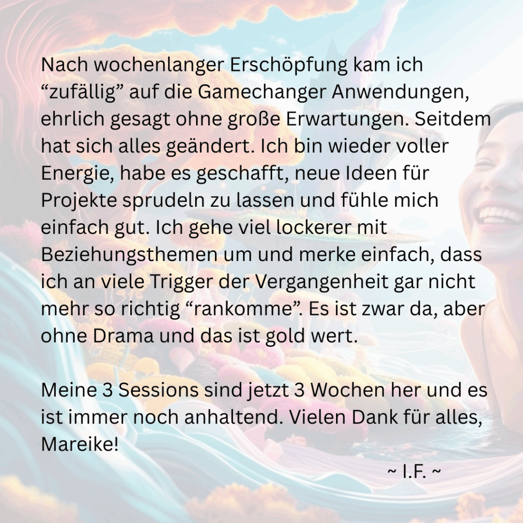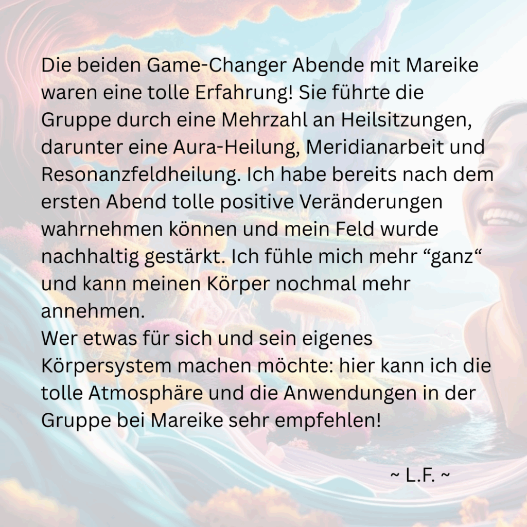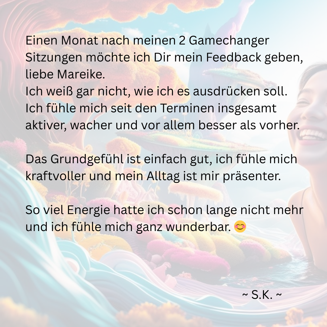Da es meist sehr viele verschiedene Muster, Traumata, Prägungen oder Ansichten zu „shiften“ gibt und es mir persönlich wichtig ist, Dich mit einem befreiten, losgelösten Sein in ein unbeschwerteres Lebensgefühl (gehen=) zu lassen, empfehle ich 2-3 Gamechanger Sessions.