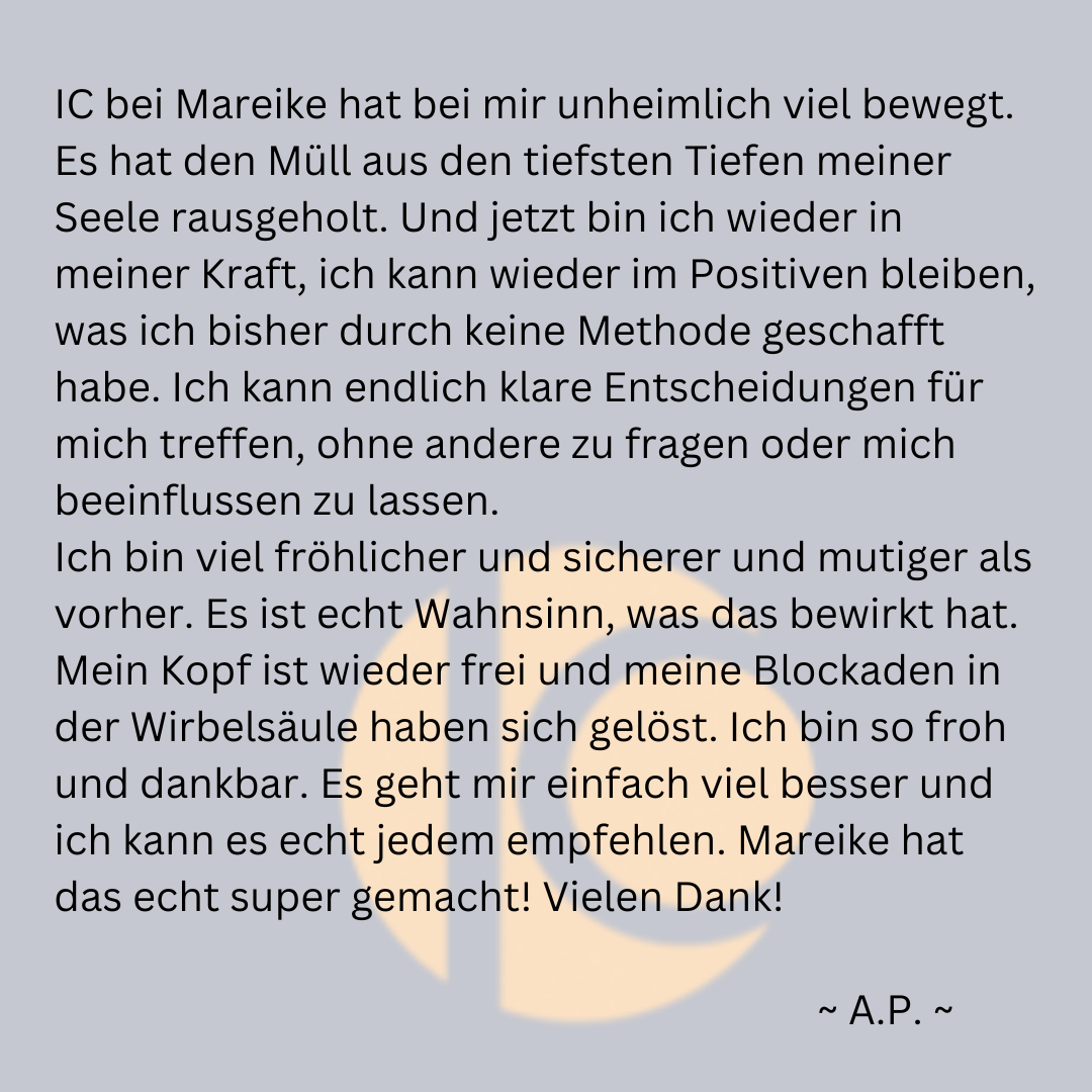 Ggf. führe ich zusätzlich einen Body Scan durch, um Blockaden zu erkennen und zu lösen oder wir machen Spezialanwendungen wie IC Ghostbusters, IC Relationships zur Stärkung der Selbstliebe oder lösen vorgeburtliche Traumata.