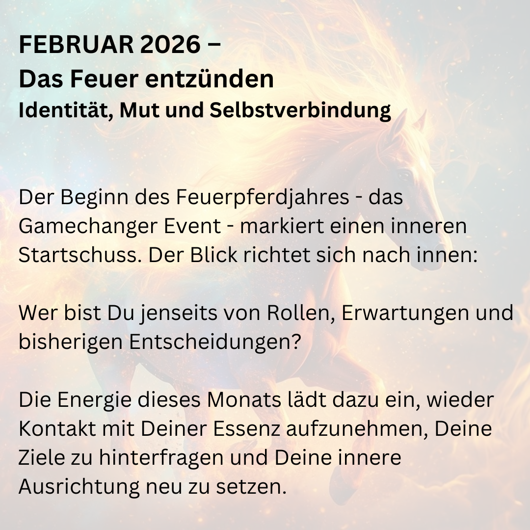 Gemeinsam starten wir in Zoom mit dem Gamechanger Event am 17.2.26, 19.2.26 (Dienstag und Donnerstag) und in der Folgewoche am 25.2.26 und 26.2.26 (Mittwoch und Donnerstag) und erleben einen erdenden, kraftvollen Auftakt in das Jahr des Feuerpferdes.