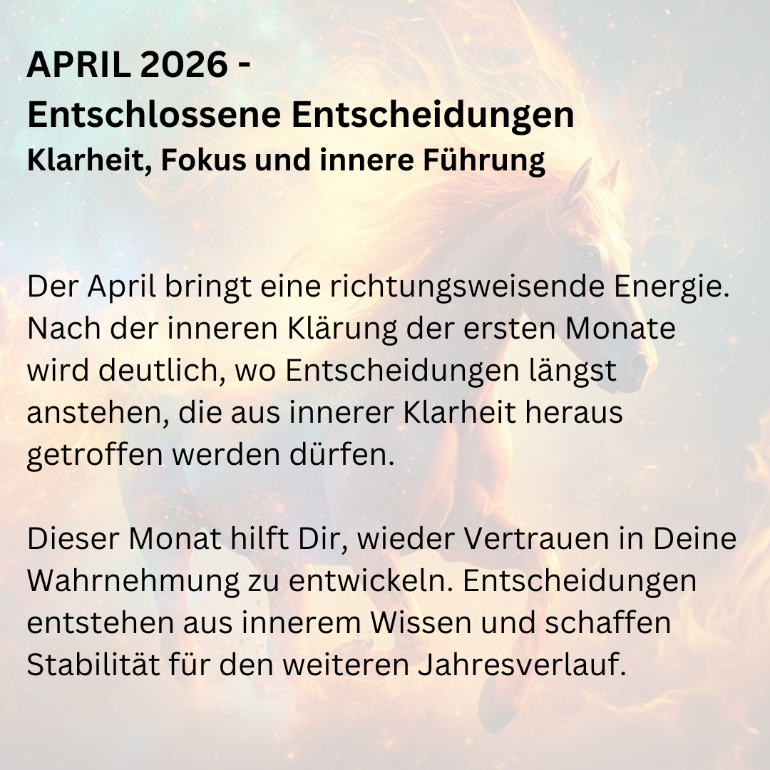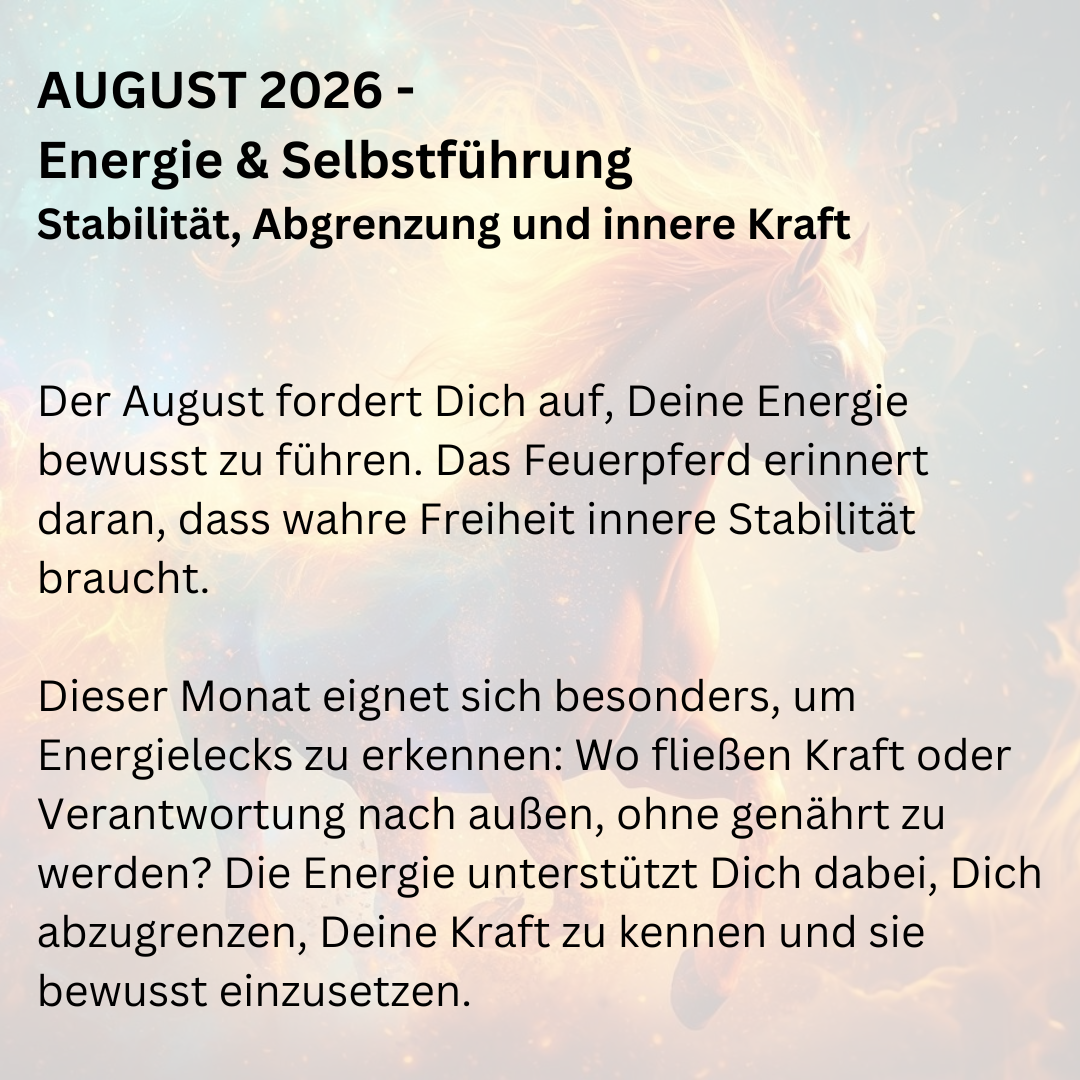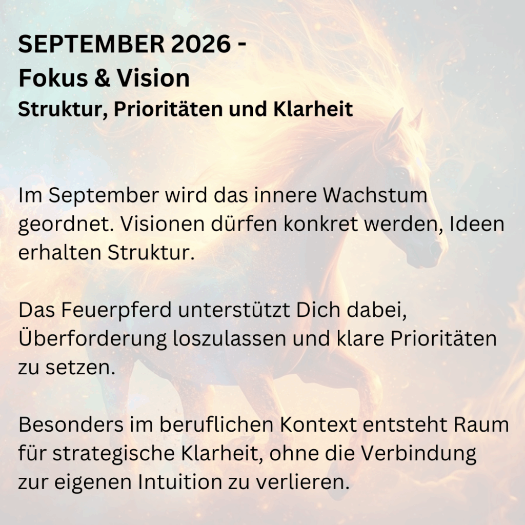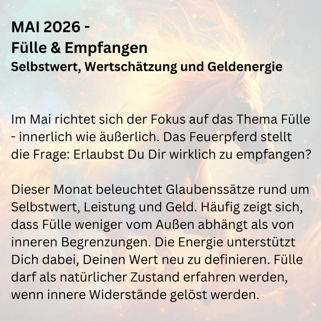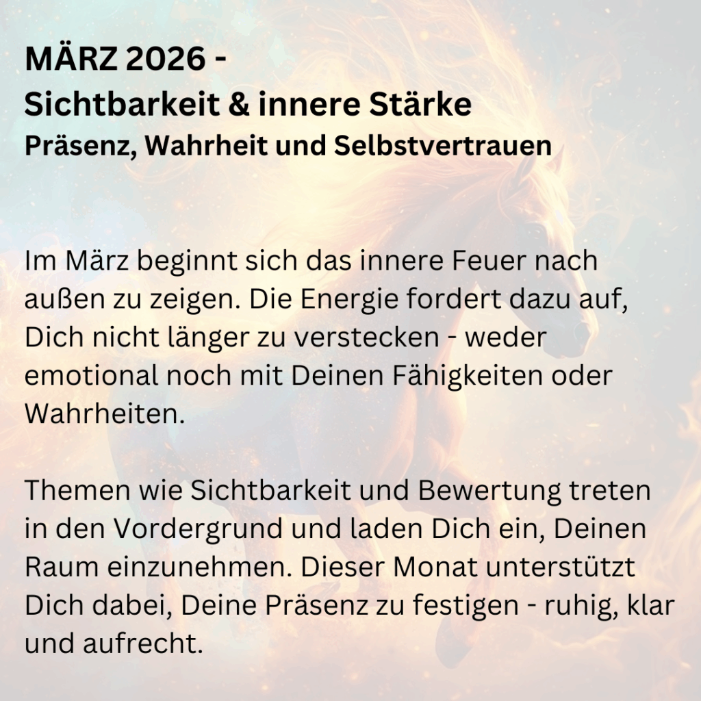 Monat für Monat widmen wir uns einem Thema, das für Deine persönliche oder berufliche Weiterentwicklung essenziell ist – immer getragen von der Energie des jeweiligen Feuerpferdmonats, immer in sanfter und klarer Begleitung.