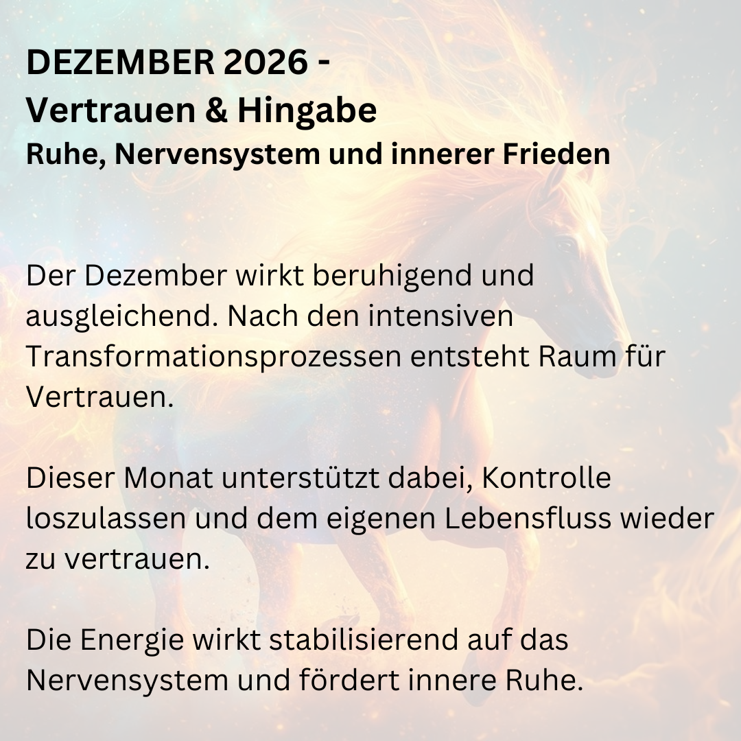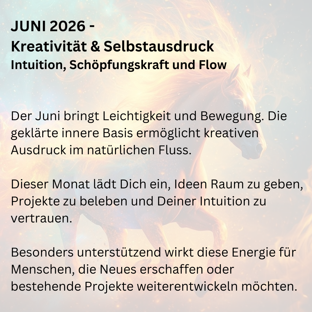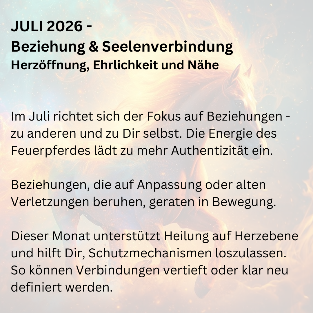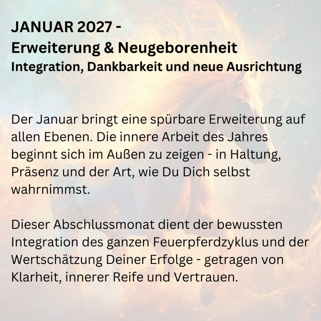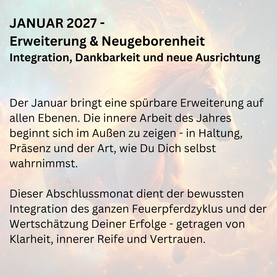 Monat für Monat widmen wir uns einem Thema, das für Deine persönliche oder berufliche Weiterentwicklung essenziell ist – immer getragen von der Energie des jeweiligen Feuerpferdmonats, immer in sanfter und klarer Begleitung.